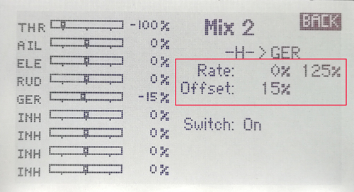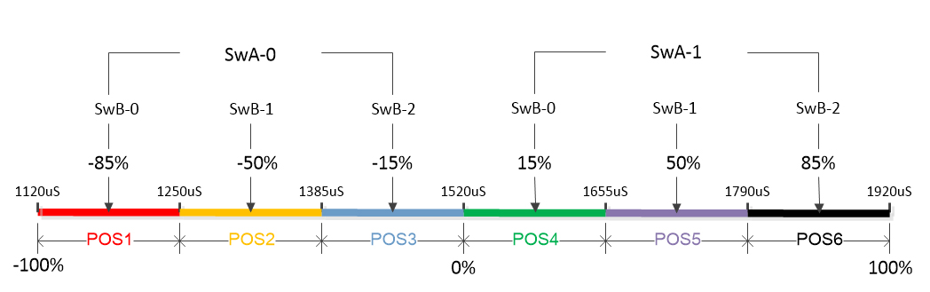 In order to achieve a 6-position switch, programmable mixing functions should be supported by your radio system. A common approach is to apply mixings on a 2-position switch (e.g. SwA) and a 3-position switch (e.g. SwB) and get 6 different position outputs on a certain channel (e.g. Gear or Flap). To make A3S3 read 6 states from the signal correctly, the pulse length of the output signal must meet the requirement of range in the following figure. In our examples, the ±85%, ±50%, ±15% of the servo travel are chosen as the set points. The result will be when SwA is in the [0] position, the output will change between -85%, -50% and -15% when you switch between the three positions of SwB, and when SwA is in the [1] position , the output will change between +15%, +50% and +85% when you switch between the three positions of SwB, as shown below.