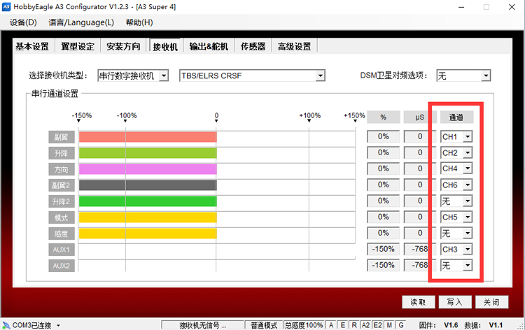使用最新版本的A3 Configurator(V1.2.3或以上)或将设置卡X升级到最新版本(V1.6或以上),更改陀螺仪的接收机类型为"串行数字接收机->TBS/ELRS CRSF"模式,并对通道定义表进行设置以符合发射机上的通道顺序,最后重启陀螺仪使新的设置生效。