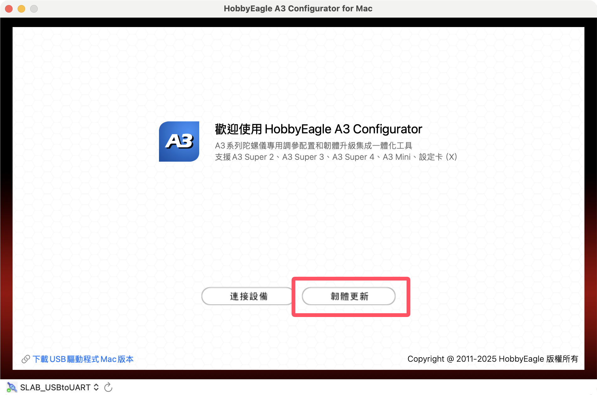 將USB適配器插入Mac的USB端口,如果您的Mac只有Type-C端口,請使用USB-A轉USB-C的轉接線進行連線。運行 A3 Configurator,打開主畫面,在左下角選擇 SLAB_USBtoUART 端口,如果您正確安裝了USB驅動程式,軟體一般情況下會自動選中該端口,如果端口列表中沒有這個端口,請重新安裝驅動程式。