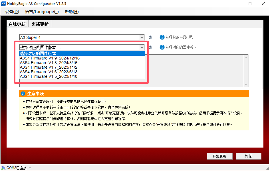 在“在线更新”页面中,从第一个下拉框中选择产品型号: