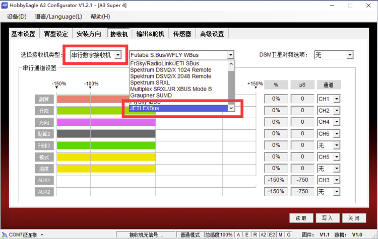 通过调参软件或设置卡,将陀螺仪的接收机类型设定更改为“串行数字接收机->JETI EXBus”模式,并对通道定义表进行设置以符合发射机上的通道顺序,最后重启陀螺仪使新的设置生效。