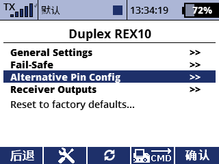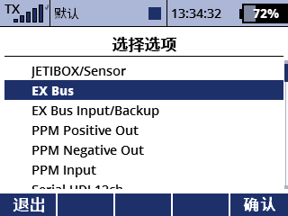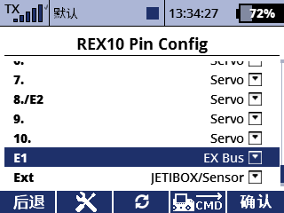 在遥控器的设备管理器菜单中,将接收机的E1或E2输出口设置为输出EX Bus,如下图: