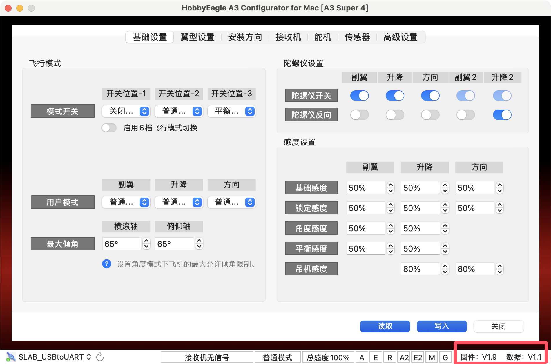 调参界面下方显示了陀螺仪当前的状态信息,包含陀螺仪状态、飞行模式、总感度大小、各输入通道的连接状态等: