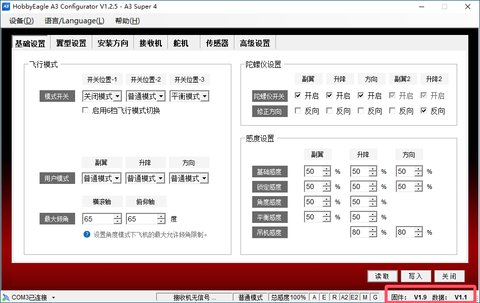 将陀螺仪连接到数据线的另一端,陀螺仪会通电自检,等待初始化完成后,点击“连接设备”按钮,即可读取陀螺仪中的设置数据并进入相应的调参界面: