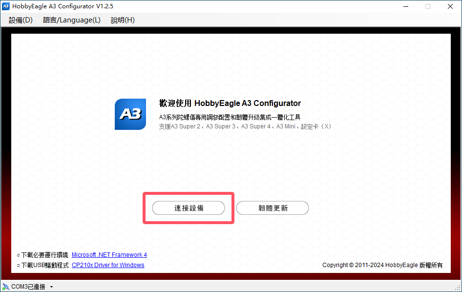 將USB適配器插入電腦的USB端口,運行 A3 Configurator,打開主畫面,在左下角選擇 COMx - Silicon Labs CP210x USB to UART Bridge 端口,如果您正確安裝了USB驅動程式,軟體一般情況下會自動選中該端口,如果端口列表中沒有這個端口,請重新安裝驅動程式。