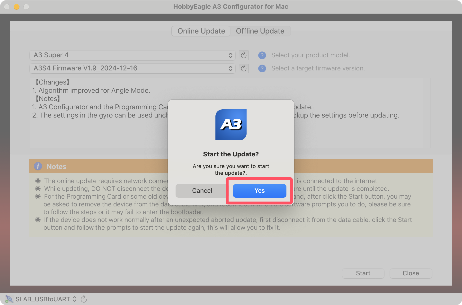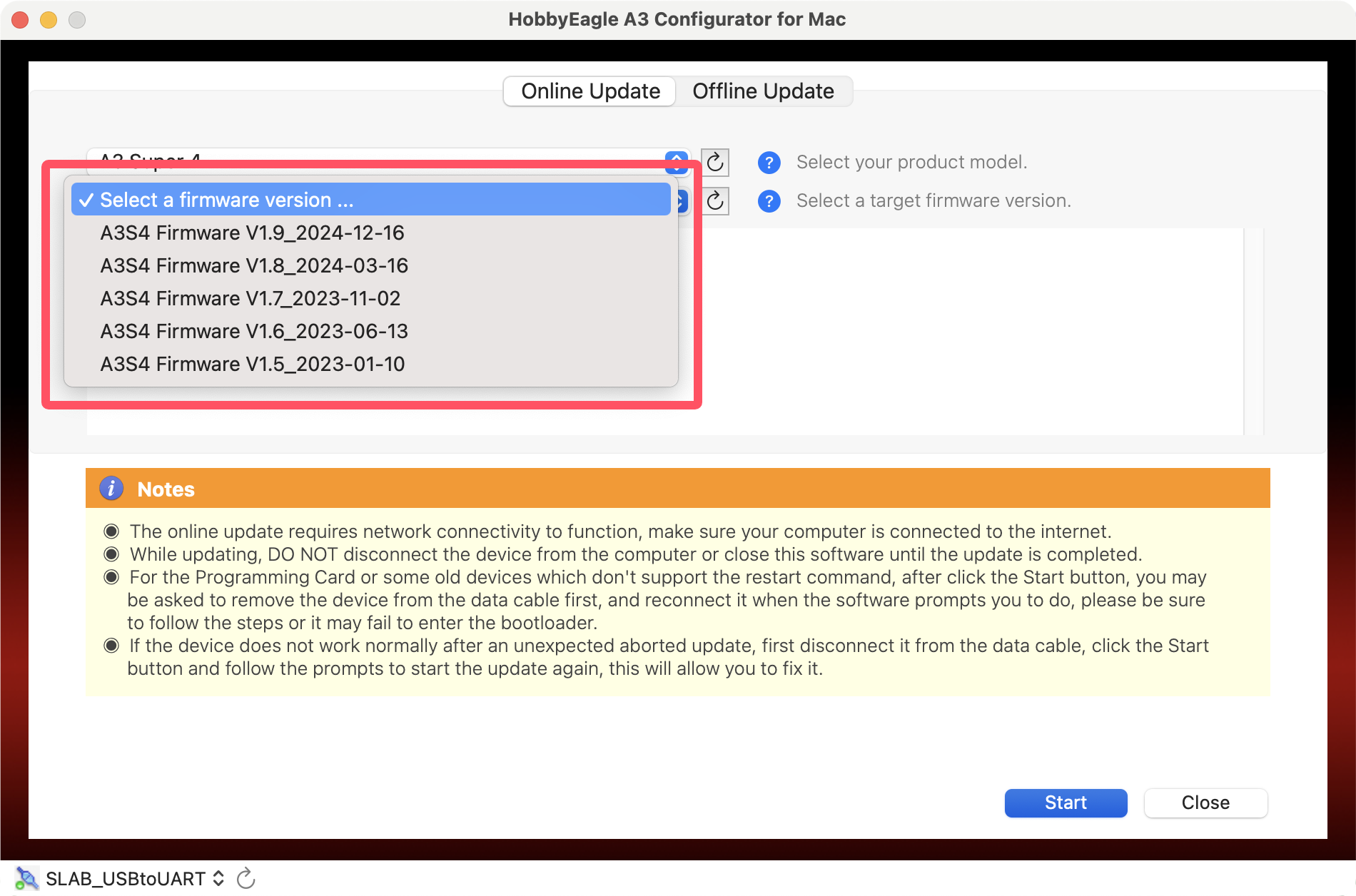 Plug the adapter into the USB port of the Mac, you may need to use an adapter cable of USB-A to USB-C if your Mac only has Type-C ports. Open the A3 Configurator and you will be directed to the welcome page. Choose the port named SLAB_USBtoUART on the bottom-left corner, the correct port will always be selected automatically if the USB driver is installed properly, if it doesn't appear in the port list, try to re-install the USB driver for Mac.