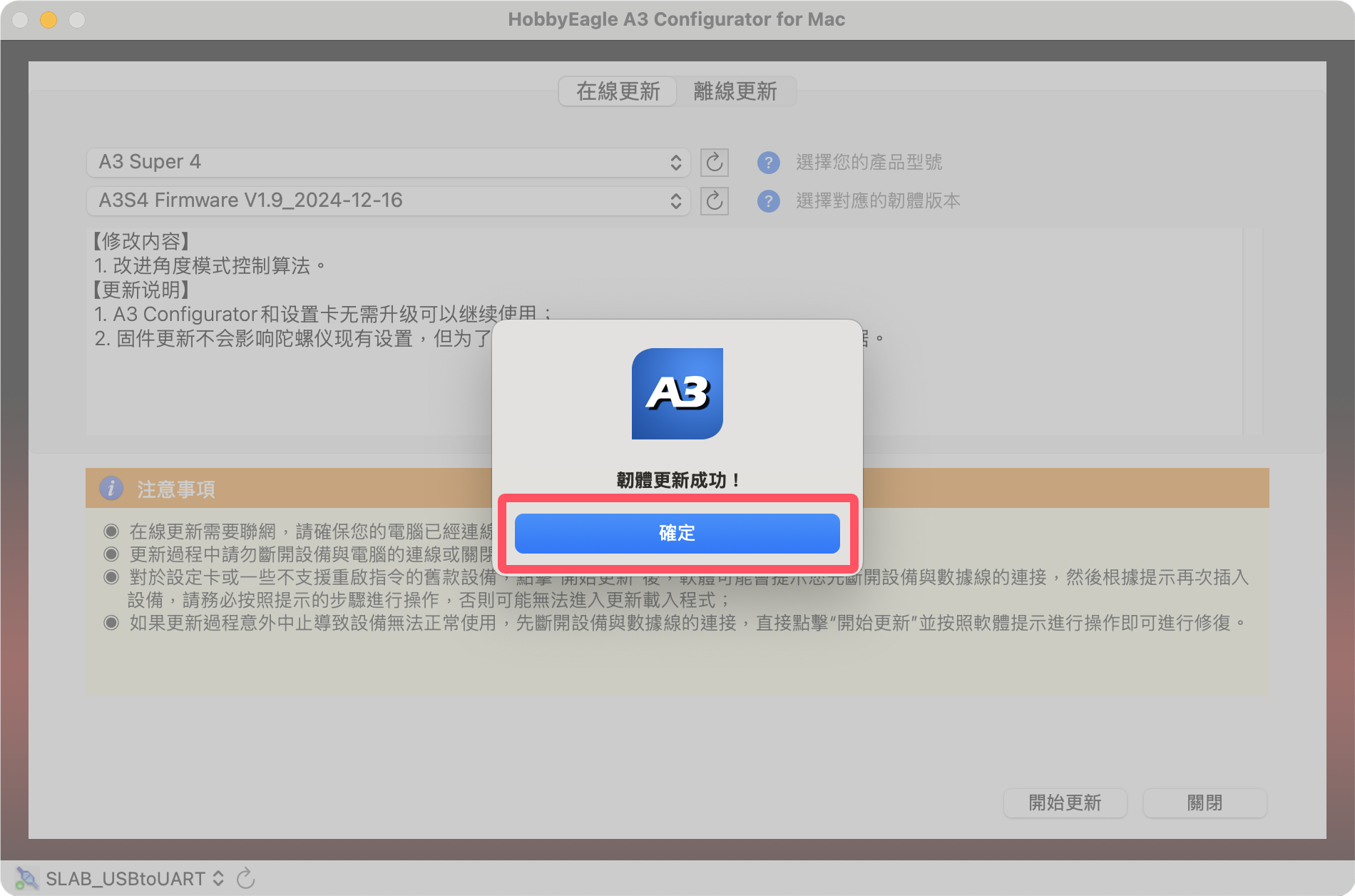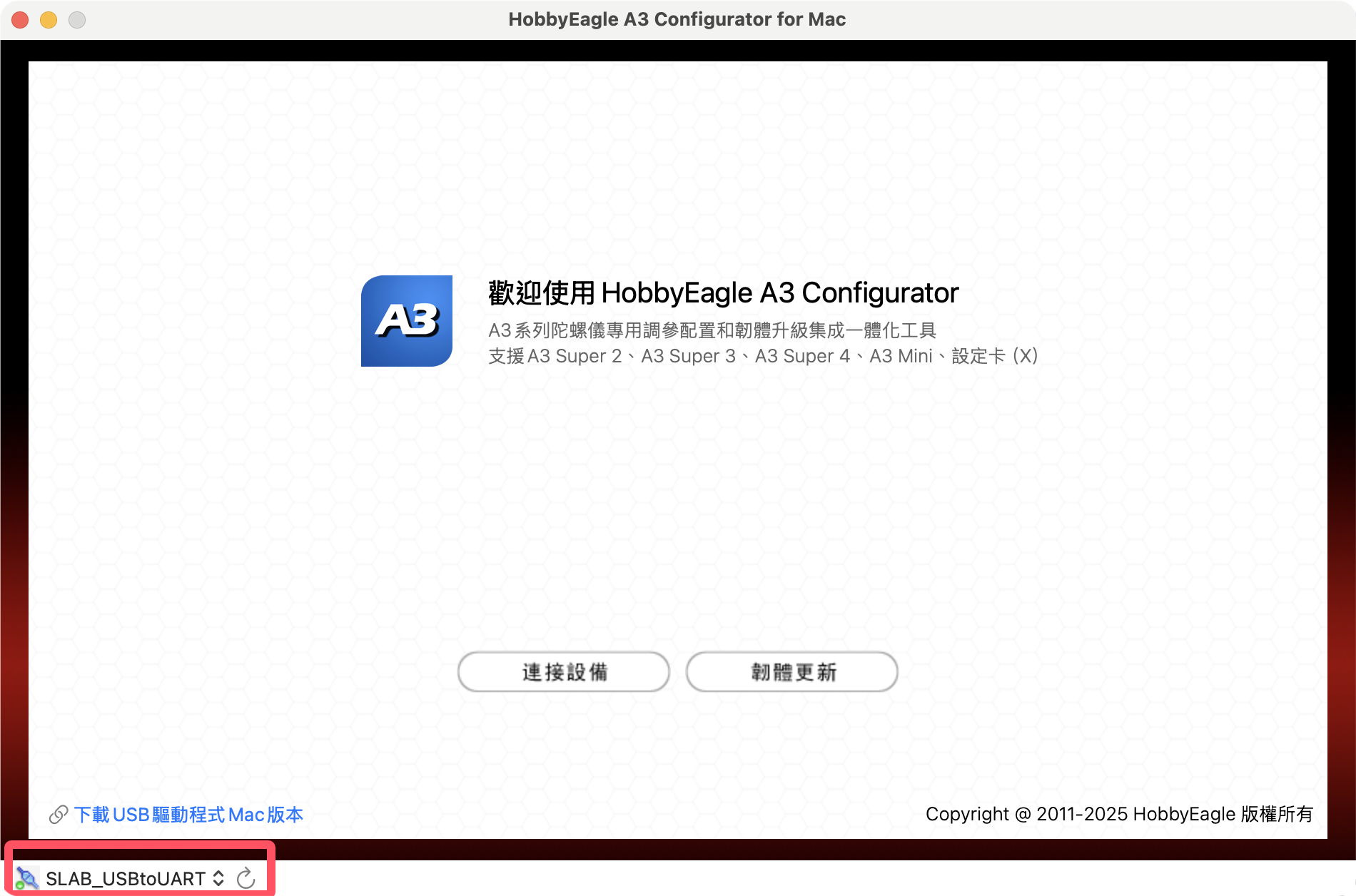 將USB適配器插入Mac的USB端口,如果您的Mac只有Type-C端口,請使用USB-A轉USB-C的轉接線進行連線。運行 A3 Configurator,打開主畫面,在左下角選擇 SLAB_USBtoUART 端口,如果您正確安裝了USB驅動程式,軟體一般情況下會自動選中該端口,如果端口列表中沒有這個端口,請重新安裝驅動程式。