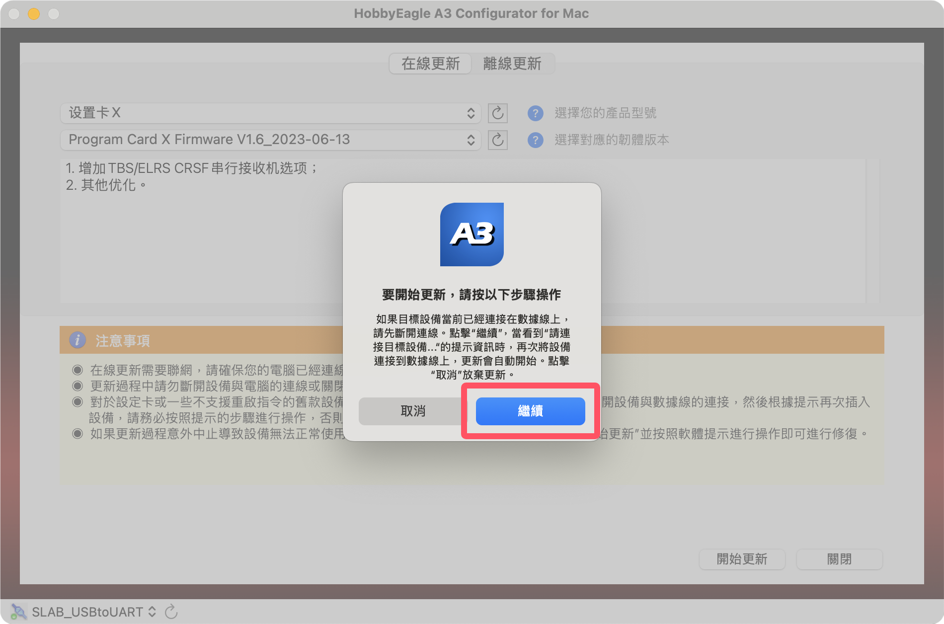 對於設置卡或一些不支援重啟指令的舊款設備,點擊"開始更新"按鈕後,軟體可能會彈出如下提示資訊,這時請先斷開設定卡或設備與數據線的連線,然後點擊"繼續"按鈕: