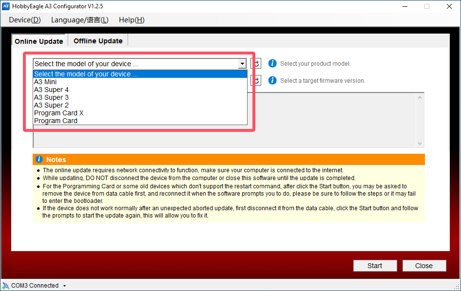 Plug the adapter into the USB port of the PC, open the A3 Configurator and you will be directed to the welcome page. Choose the port named COMx - Silicon Labs CP210x USB to UART Bridge on the bottom-left corner, the correct port will always be selected automatically if the USB driver is installed properly, if it doesn't appear in the port list, try to re-install the USB driver.