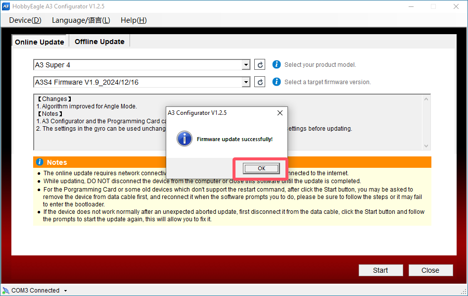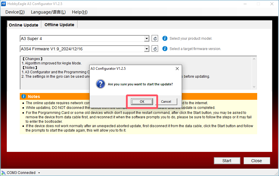 The update will start, please wait for the update to complete, DO NOT disconnect the device from the PC while updating.