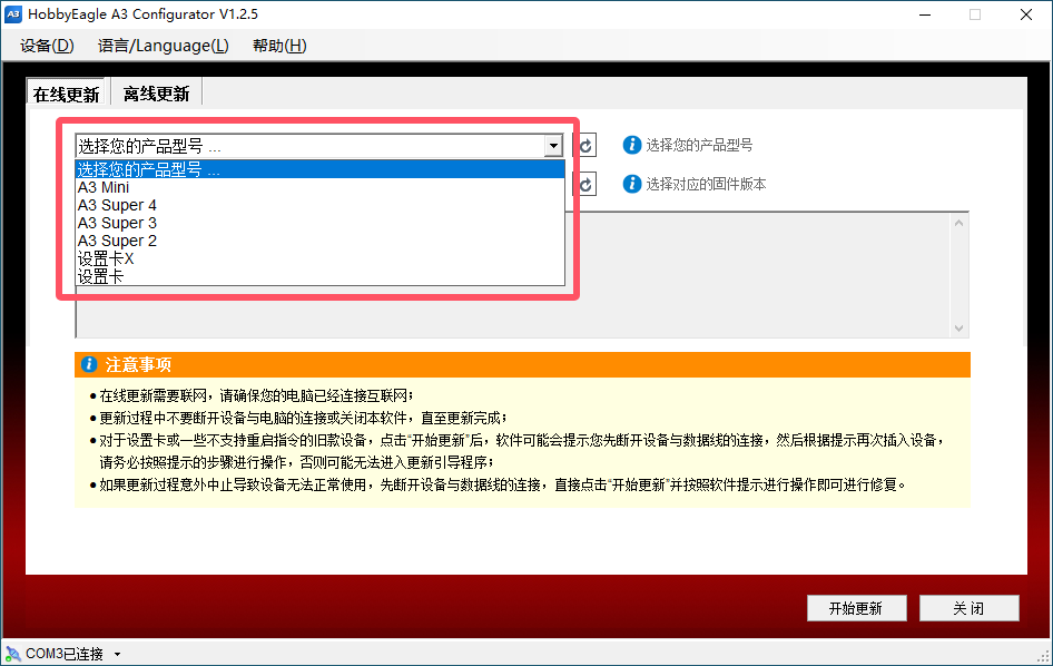 在“在线更新”页面中,从第一个下拉框中选择产品型号: