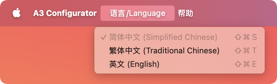 A3 Configurator支持简体中文、繁体中文和英文界面,点击菜单项“语言/Language”,选择相应的语言,重启软件即可生效: