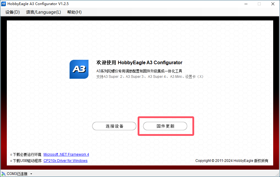 在软件主页面点击“固件更新”按钮,打开固件更新向导: