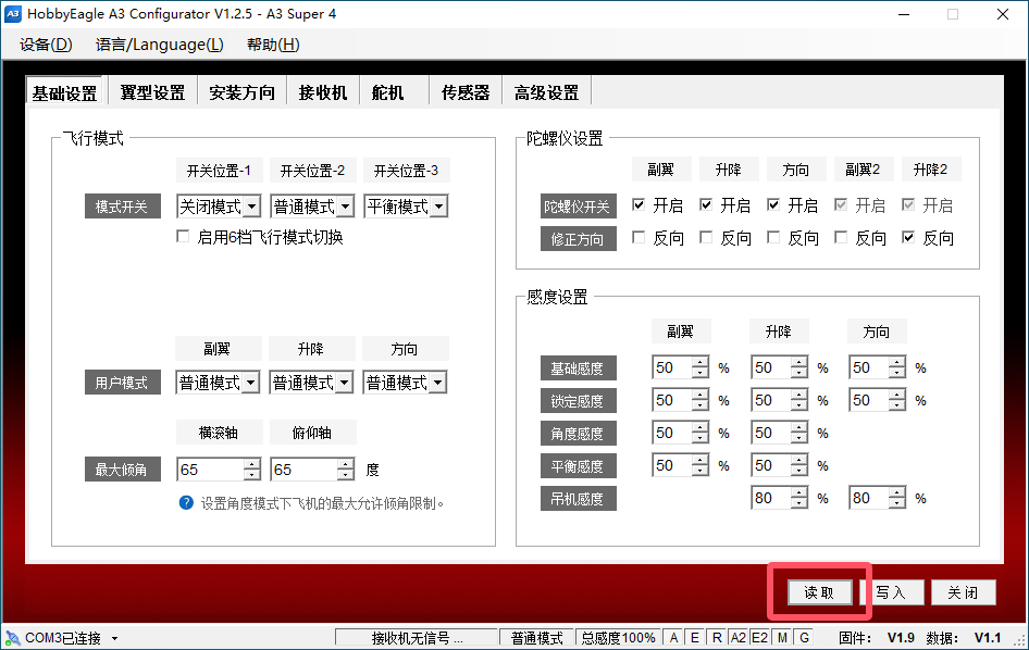 点击“读取”按钮可以重新读取陀螺仪中的设置数据,重新读取将覆盖调参界面中未保存的数据: