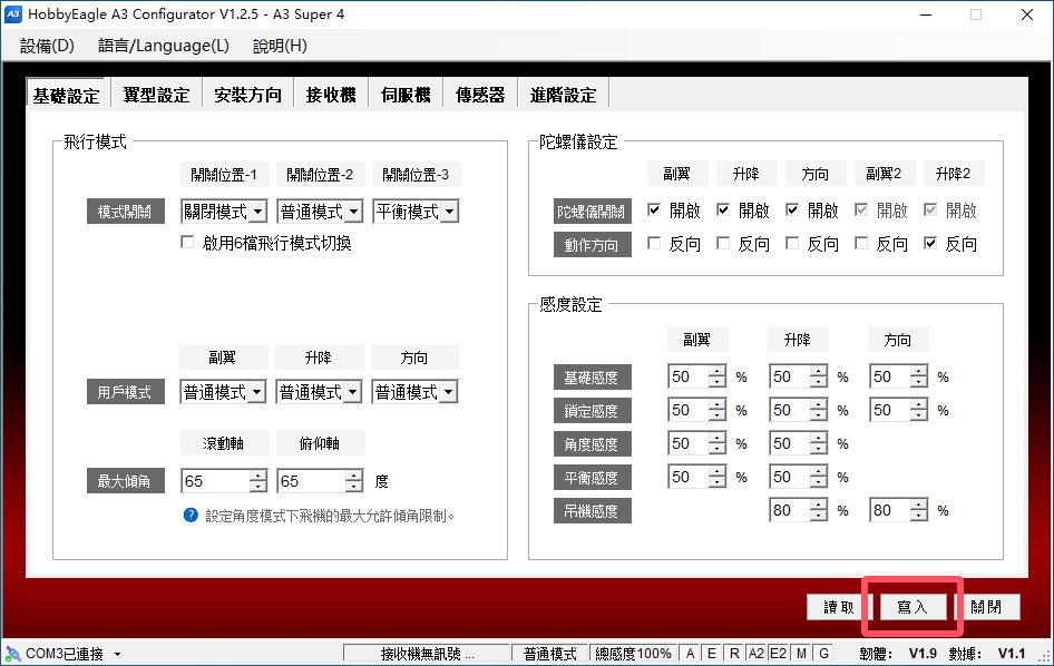 修改完设定後,點擊"寫入"按鈕,將更改儲存到陀螺儀中:
