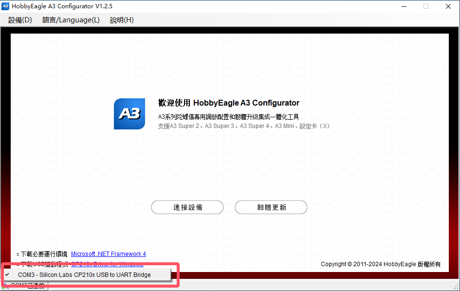 將USB適配器插入電腦的USB端口,運行 A3 Configurator,打開主畫面,在左下角選擇 COMx - Silicon Labs CP210x USB to UART Bridge 端口,如果您正確安裝了USB驅動程式,軟體一般情況下會自動選中該端口,如果端口列表中沒有這個端口,請重新安裝驅動程式。
